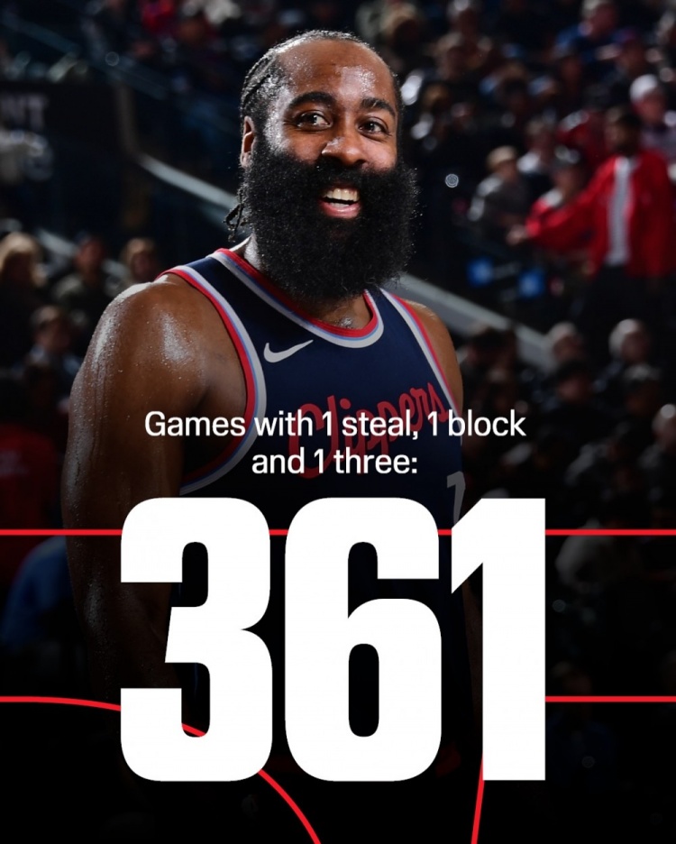 NBA历史上仅有三位球员至少有350场常规赛单场砍下至少1盖帽+1抢断+1三分,他们分别是:詹姆斯(464)、杜兰特(397)和哈登(361)。