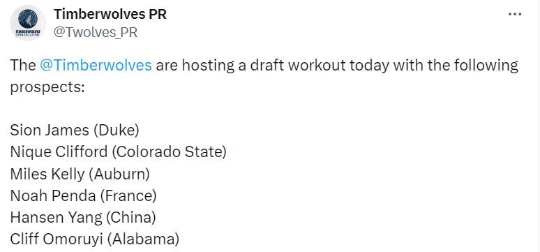 北京时间6月17日,森林狼官方宣布了今日试训的6人名单,中国球员杨瀚森名列其中。这是杨瀚森今年夏天试训的第10支NBA球队,此前他已经在开拓者、爵士、太阳、雄鹿、魔术、步行者、篮网、凯尔特人和老鹰完成试训。媒体人周鹏表示,瀚森今天身穿85号。