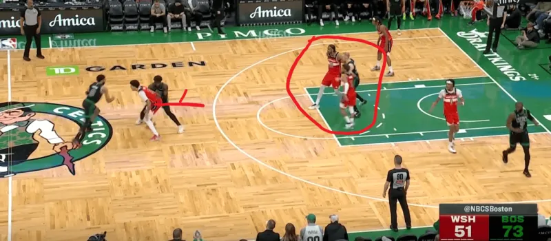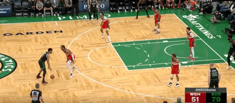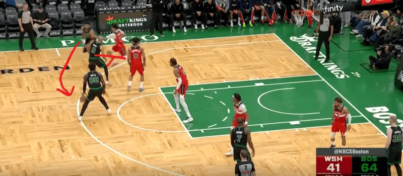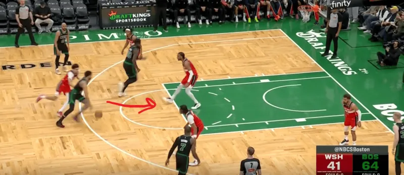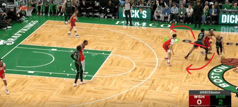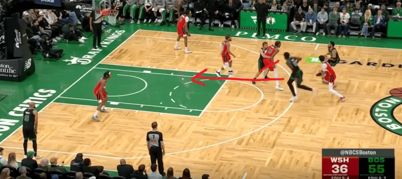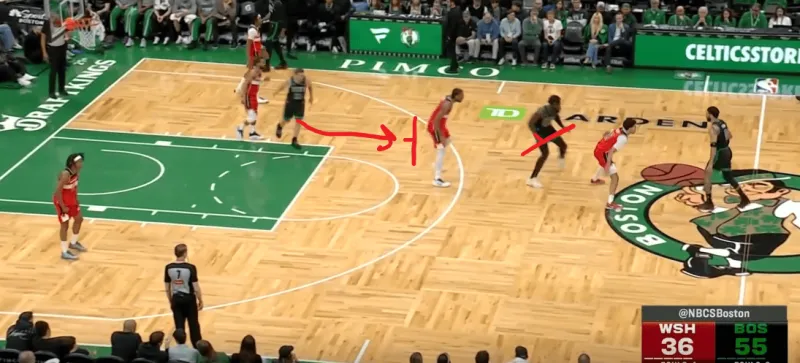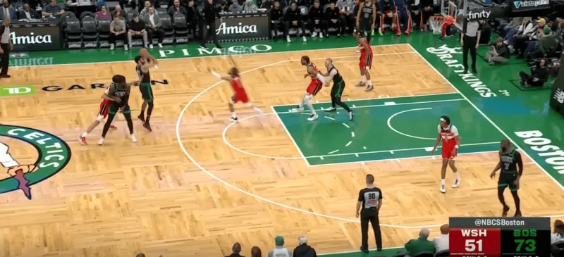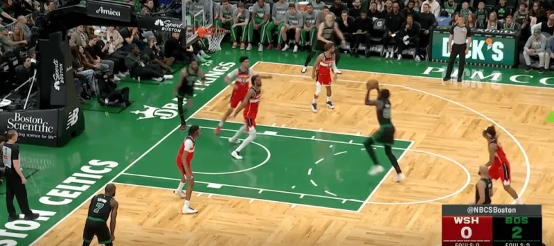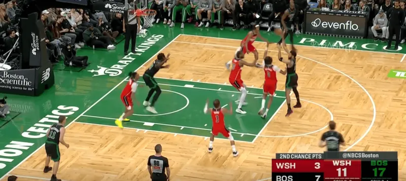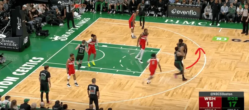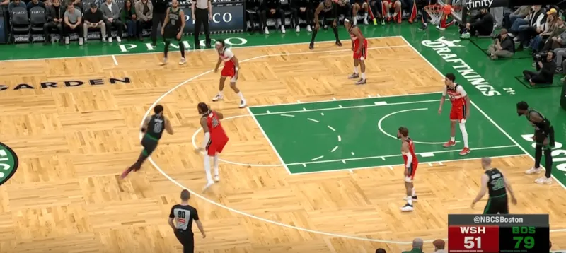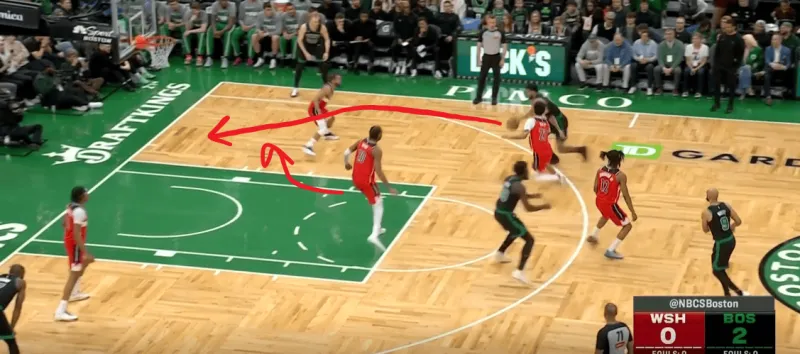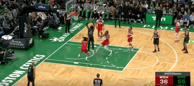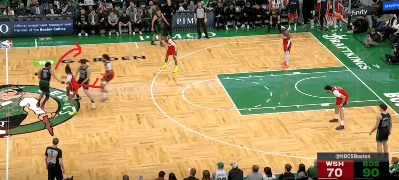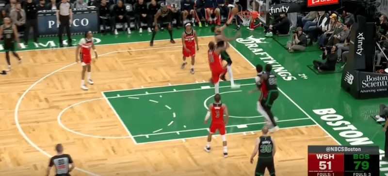 塔图姆提上和奎塔手递手接应,奎塔迅速溜入禁区,塔图姆利用萨尔的延误高吊篮下,奎塔对位低位的卡灵顿如入无人之境完成扣篮: